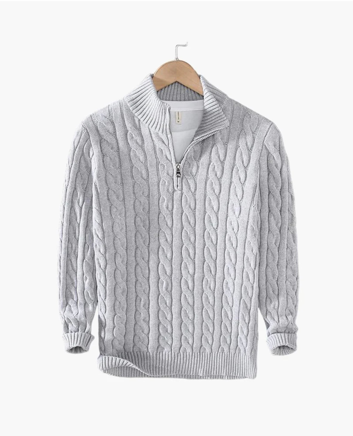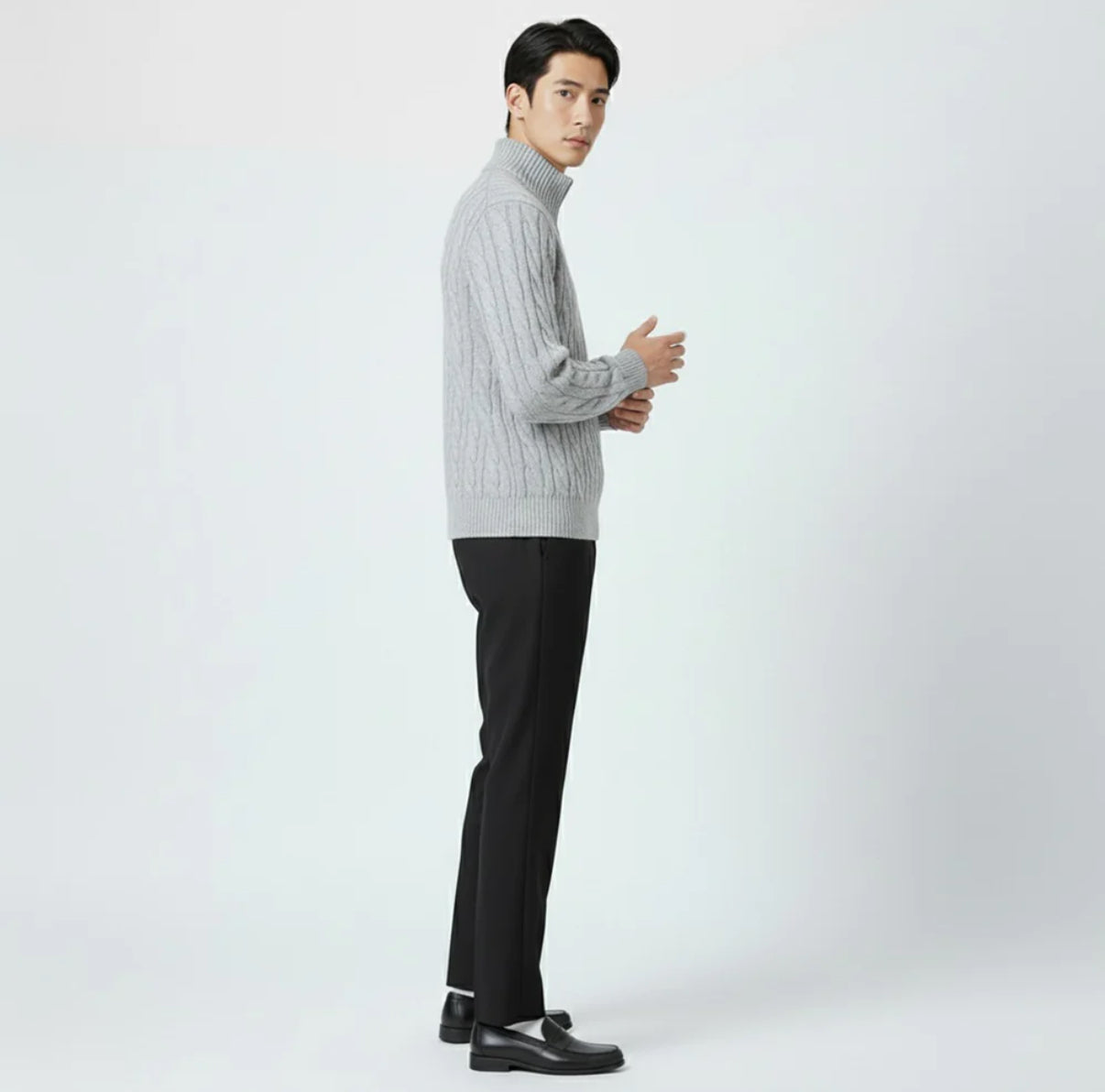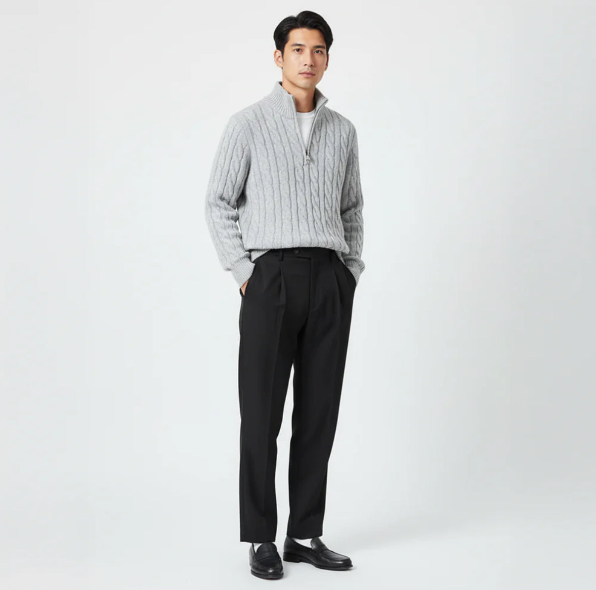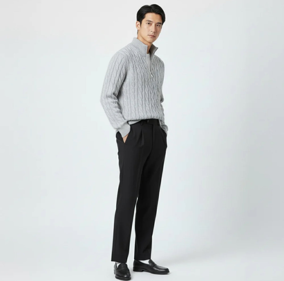 A soft ash-grey cable-knit half-zip layered over tailored black trousers, designed for men who prefer restraint over spectacle. The texture adds depth without excess, while the dark base grounds the look in seriousness and control.